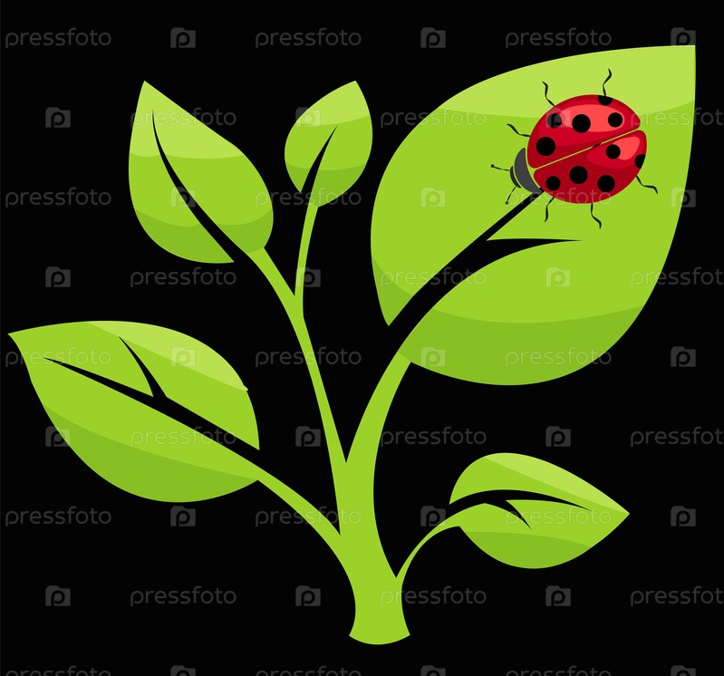 Векторная иллюстрация зеленого растения с яркими листьями и красной божьей коровкой в простом стиле на черном фоне