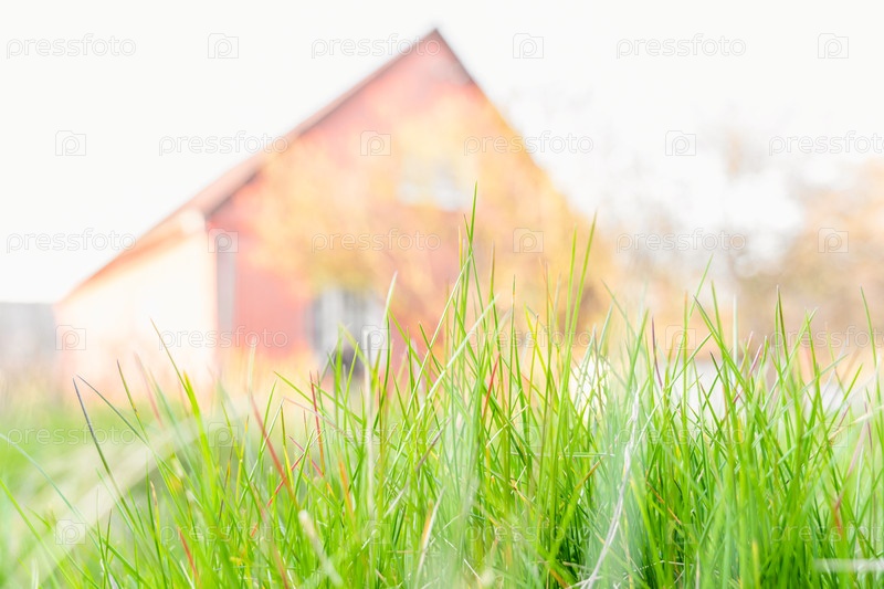 Зеленая трава с домом на заднем плане, размытый фон, вид снизу