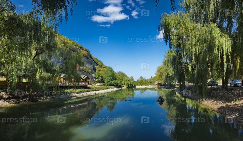 Россия, Мангуп-Кале. Воздушные плакучие ивы на берегу искусственного озера у подножья знаменитого древнего города