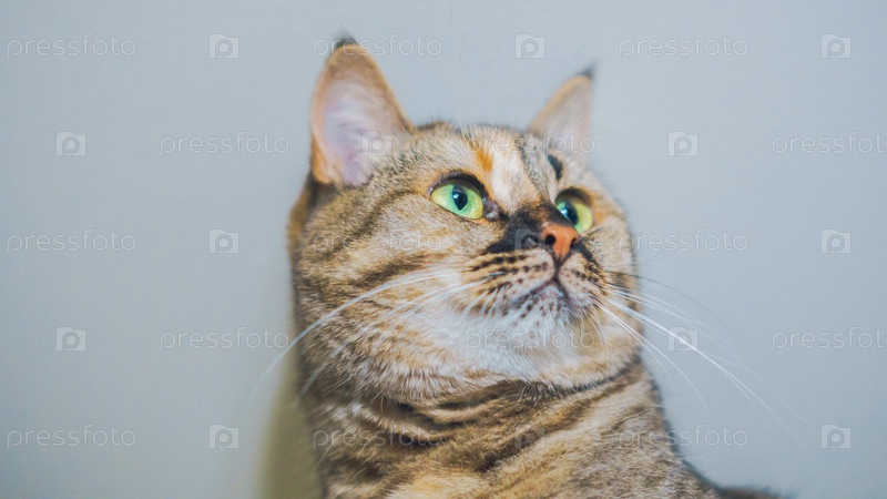 Кот забрался очень высоко и выглядит очень довольным, вид снизу