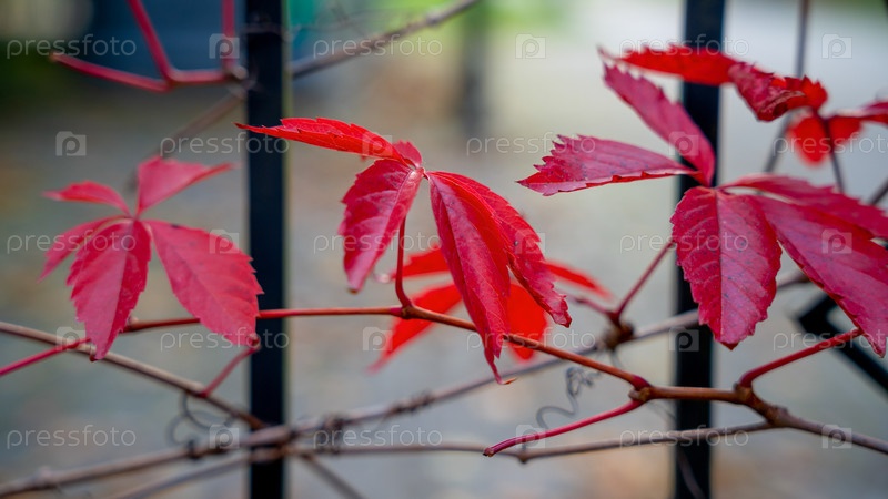 Красные осенние листья на ограде парка