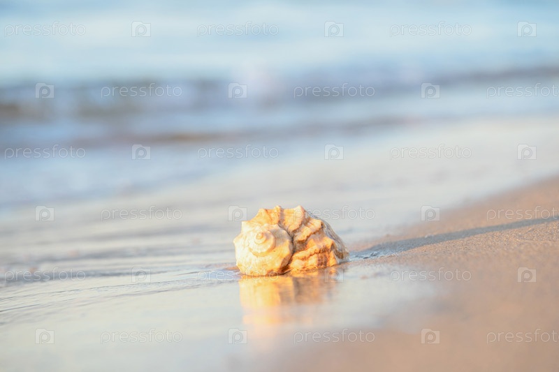 Красивая ракушка лежит на пляже, рядом с лазурной водой моря