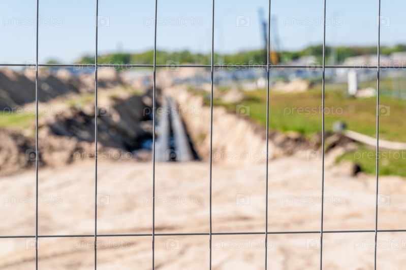 Строительные работы, котлован с трубами, огорожен, размытый фон, фокус на переднем плане