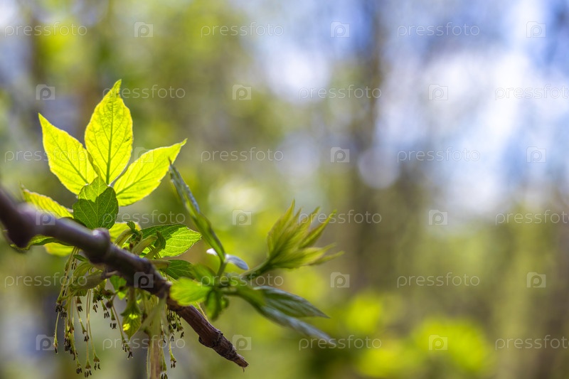 Первые листья и почки весной на ярком солнце. Фон с копией пространства