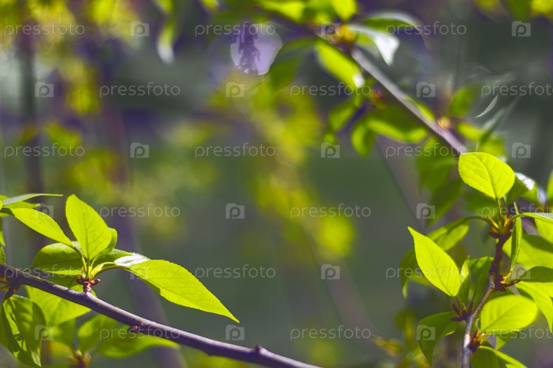 Рамка из первых листьев дерева весной в лучах яркого солнца. Фон с копией пространства