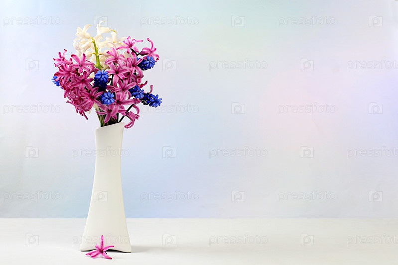 Красивые весенние цветы гиацинты и мускари в вазе на светлом фоне, баннер, абстрактная цветочная композиция, натюрморт с местом для текста, цветочная праздничная открытка, концепция летнего приветствия,