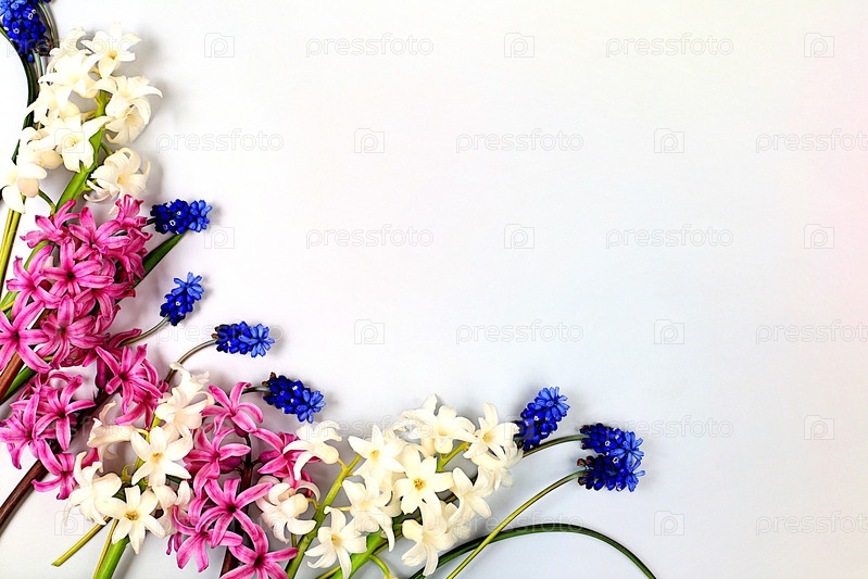 Красивые весенние цветы гиацинты и мускари на светлом фоне, баннер, абстрактная цветочная композиция, натюрморт с местом для текста, цветочная праздничная открытка, концепция летнего приветствия