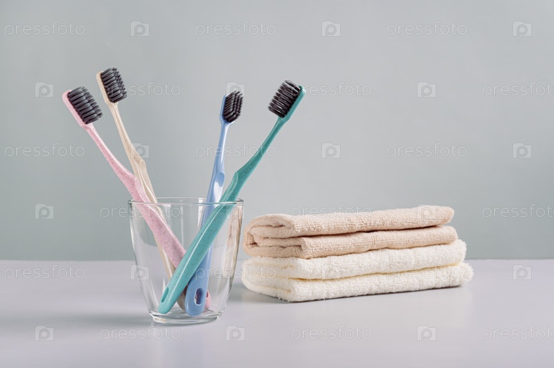 Чистые зубные щетки в прозрачном стакане и полотенца на столе