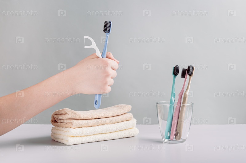 Зубная щетка и зубная нить в руке на фоне туалетных принадлежностей