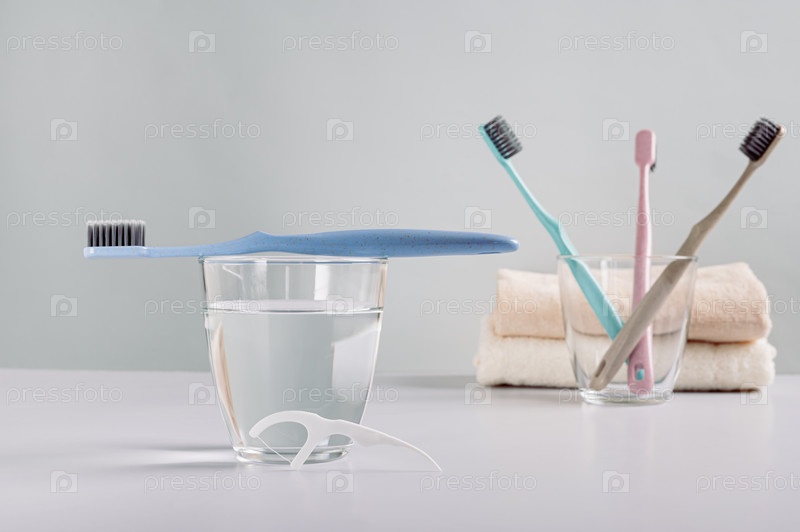Зубная щетка на стакане воды, одноразовая зубная нить в ванной