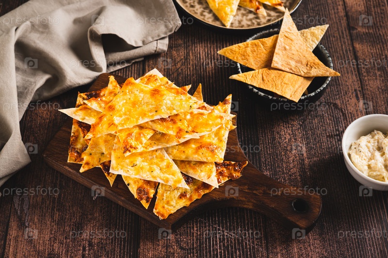 Домашние питы-начос с сыром и чесноком на доске на столе