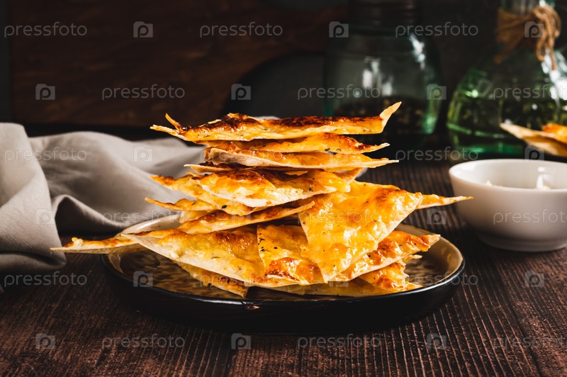 Домашние чипсы из питы с сыром и чесноком на доске на столе