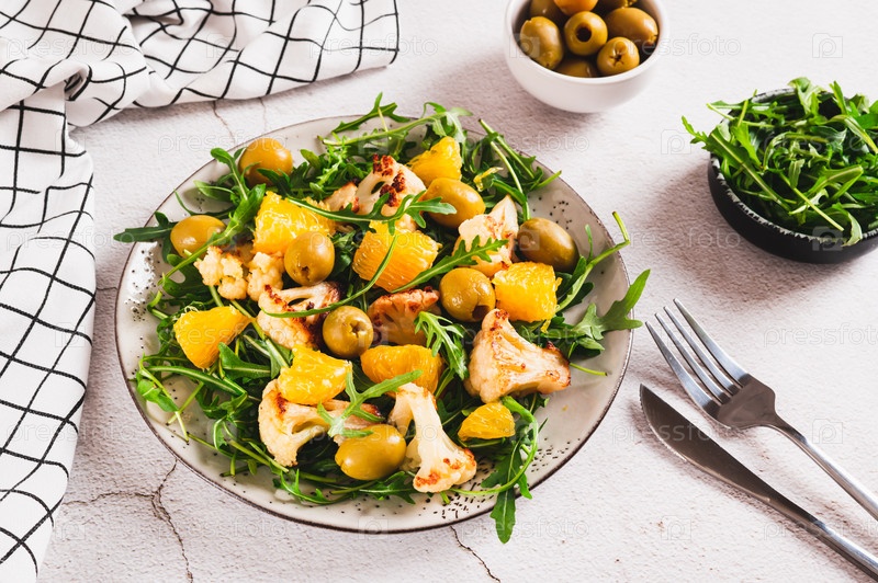 Домашний салат из цветной капусты, апельсина, оливок и зелени на тарелке на столе