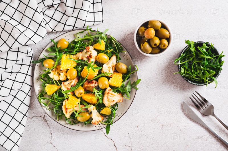 Вегетарианский салат с цветной капустой, апельсином, рукколой и оливками на тарелке вид сверху