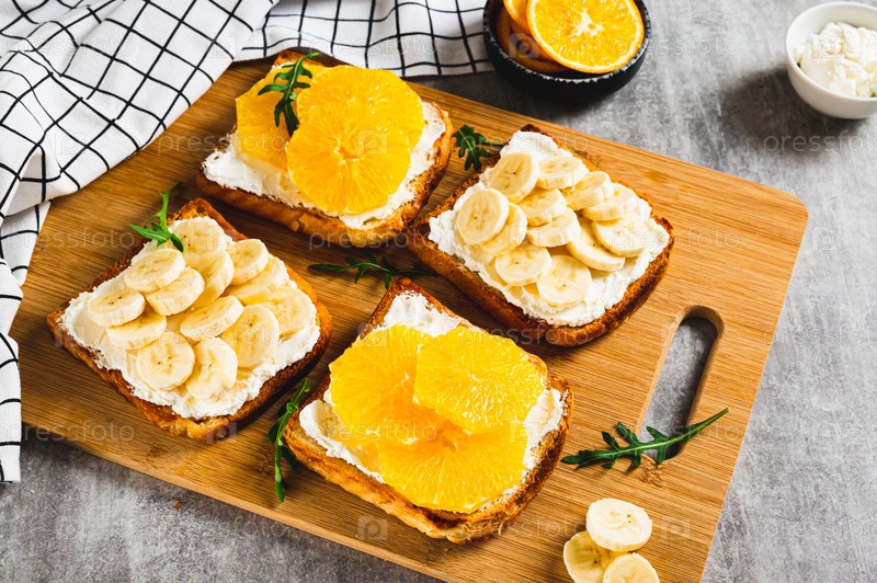 Сэндвичи с рикоттой, апельсином и бананом на доске на столе