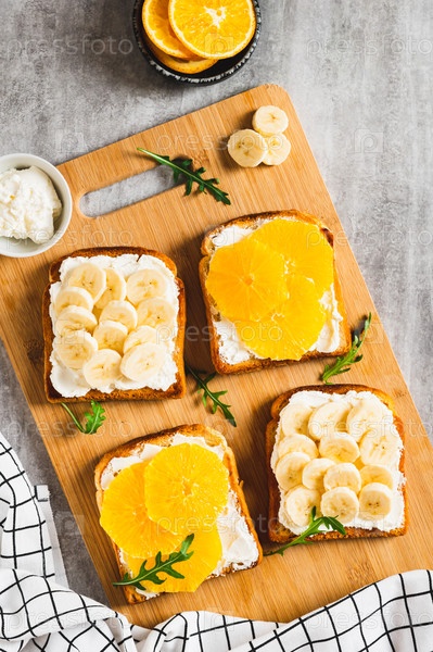 Сэндвичи с рикоттой, апельсином и бананом на доске на столешнице и вертикальный вид