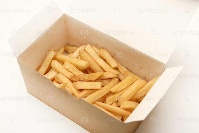 Картофель фри на картонной коробке. Жареный картофель в упаковке