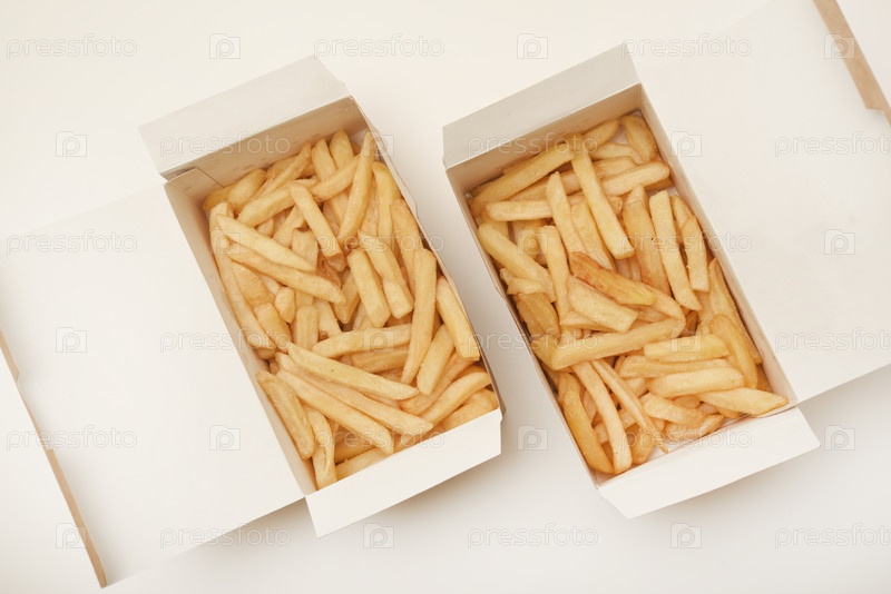 Картофель фри на картонной коробке. Жареный картофель в упаковке