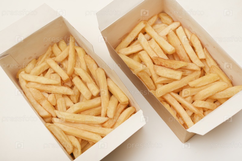 Картофель фри на картонной коробке. Жареный картофель в упаковке