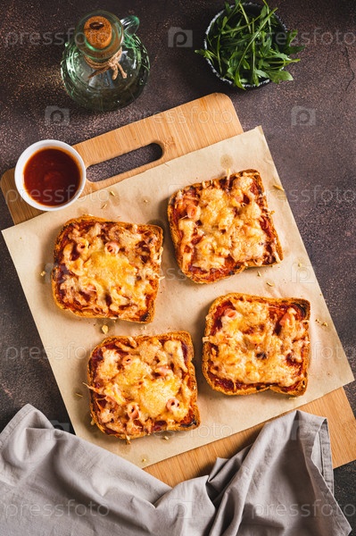 Домашняя пицца из хлеба с беконом и сыром на доске на столешнице и вертикальный вид