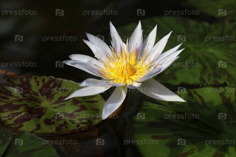 Водная лилия (лат. Nymphaea) на фоне красочных листьев цветет в тропической водной оранжерее