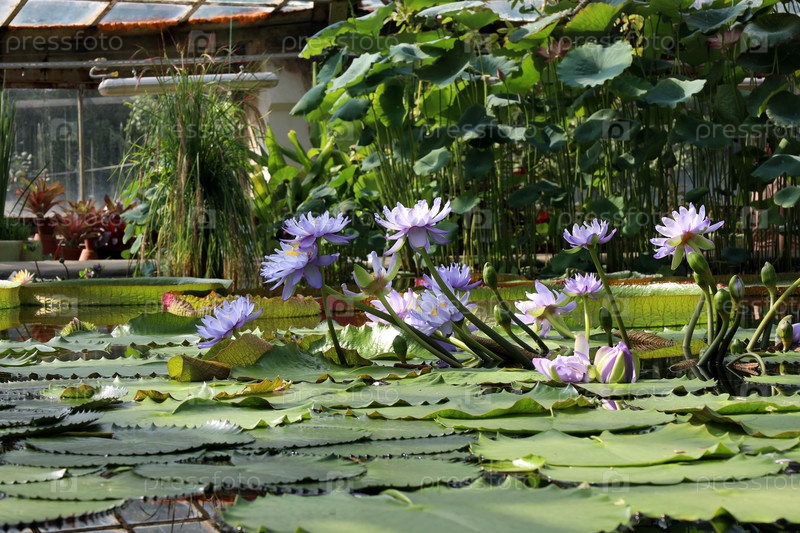 Цветущая голубая кувшинка (лат. Nymphaea) в тропической водной оранжерее