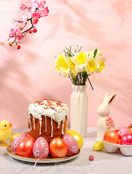 Абстрактная пасхальная композиция с традиционным русским куличом с безе и украшенными яйцами на элегантном кухонном столе с весенними цветами сакуры. Концепция счастливой пасхи. Экранный баннер
