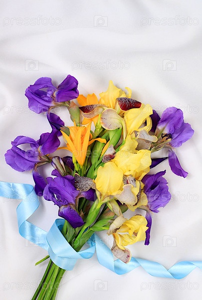 Абстрактная цветочная композиция, плоская планировка, красивые сибирские ирисы на элегантном фоне, баннер весна и лето. Креативный современный букет. Открытка на День матери, с днем рождения, свадьба, узор