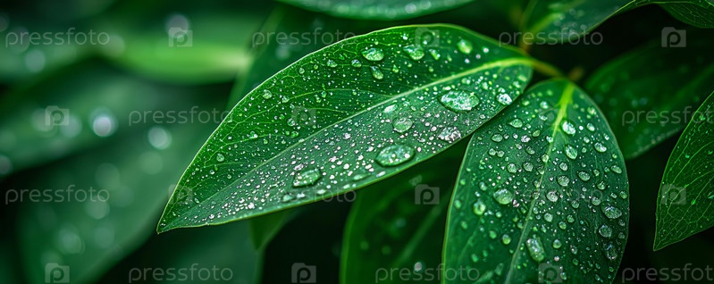 Макросъемка свежих зеленых листьев с каплями дождя