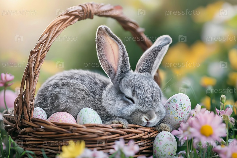 Очаровательный серый кролик спит в корзинке с пасхальными яйцами среди весенних цветов