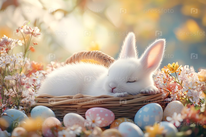 Белый кролик спит в корзинке с пасхальными яйцами, окруженный весенними цветами