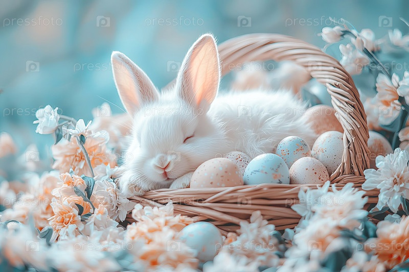 Белый кролик спит в корзинке с пасхальными яйцами, окруженный весенними цветами