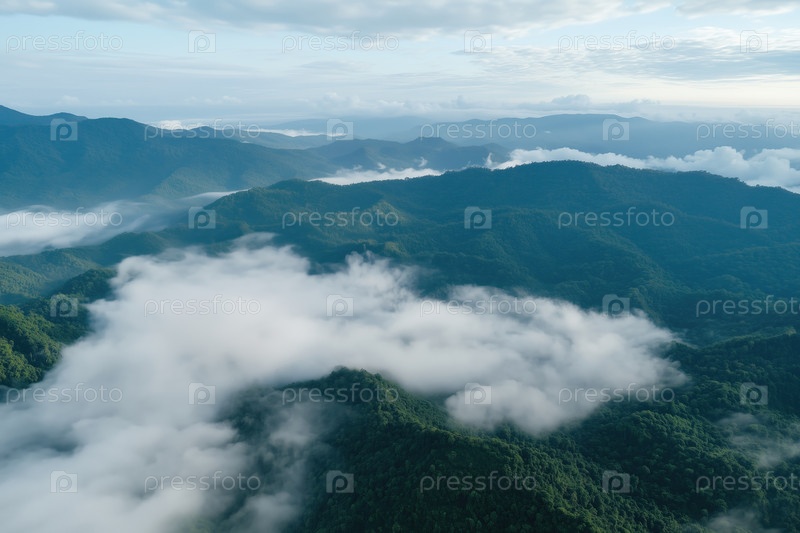 Вид с воздуха на туманный лесистый горный хребет утром