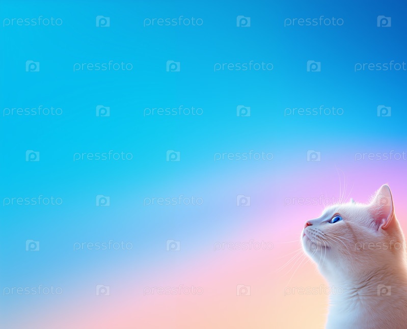 Красивый белый кот с синим и розовым градиентным фоном. Копировать пространство