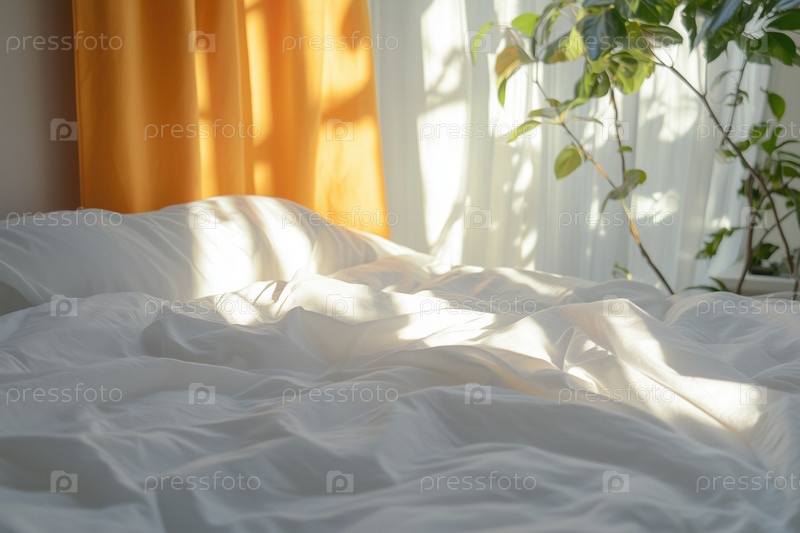 Белое постельное белье на кровати в лучах утреннего солнца