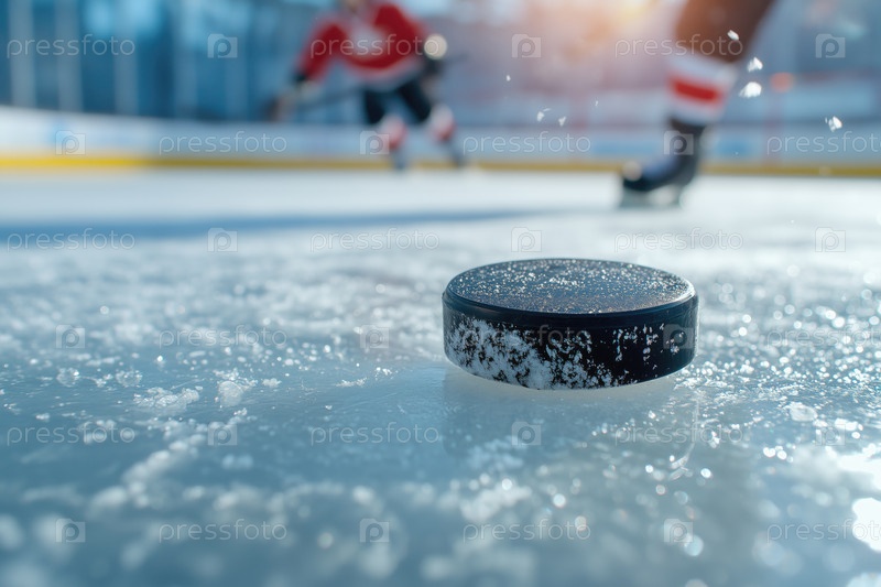 Хоккеисты на льду, крупный план шайбы