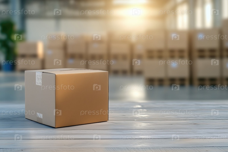 Картонная коробка на полу на складе с размытым фоном, концепция транспортировки грузов и дистрибуции