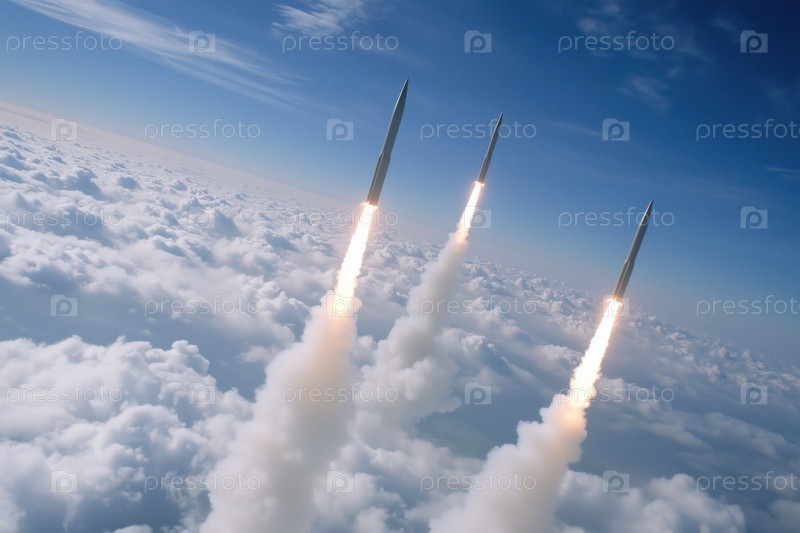 Три ракеты летят высоко над облаками, оставляя инверсионные следы