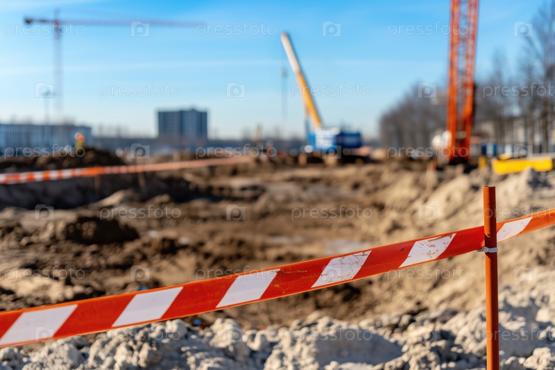 Строительная площадка с крупным планом оградительной ленты на переднем плане и краном на заднем плане