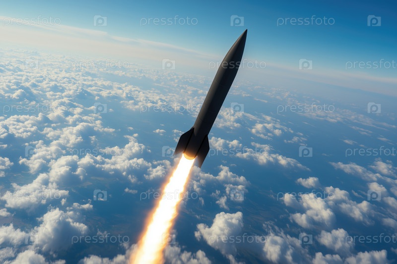 Баллистическая ракета малой дальности летит в синем небе над облаками
