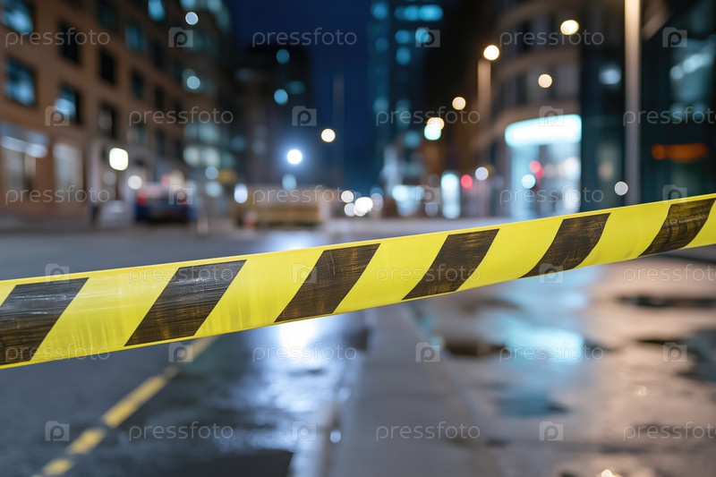 Желтая предупреждающая лента на улице в городе ночью. Размытый фон
