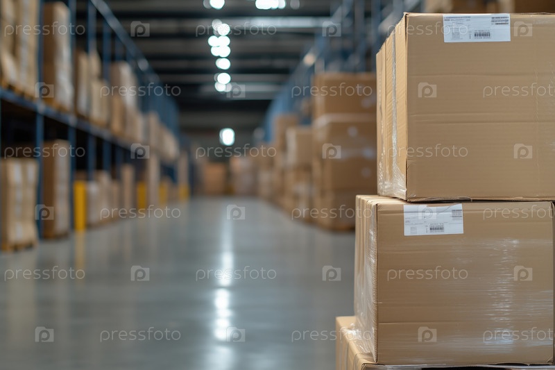 Интерьер склада с полками и ящиками, малая глубина резкости