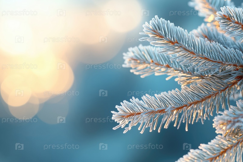Ветки ели, покрытые инеем, на размытом фоне боке