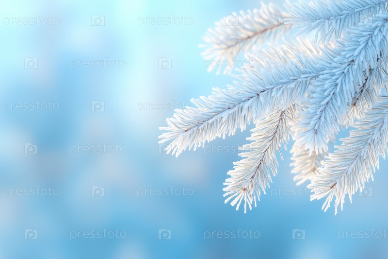 Ветка ели в инее на синем фоне, зимний фон