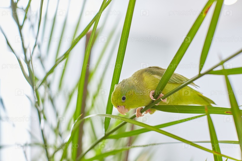 Милый попугай.Forpus passerinus на ветке финиковой пальмы.Самая маленькая птица в семействе папугаев с зеленым телом