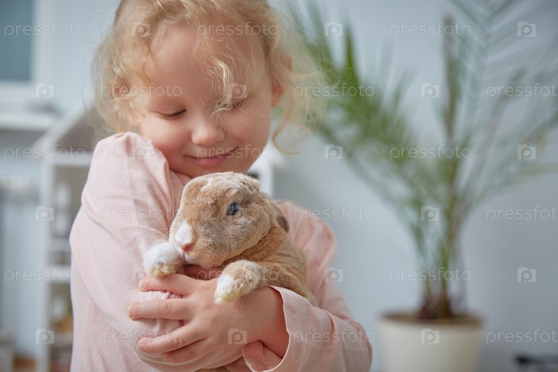 Милая девочка-малыш обнимает кудрявого кролика дома. Девочка с кроликом, домашний кролик. Копировать пространство
