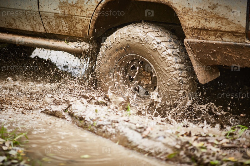 Езда по бездорожью по грязной дороге. Крупный план колеса. Мягкий фокус