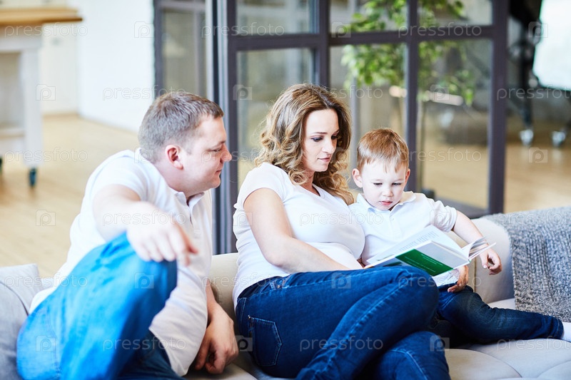 Семья с маленьким ребенком сидит на диване и читает книгу