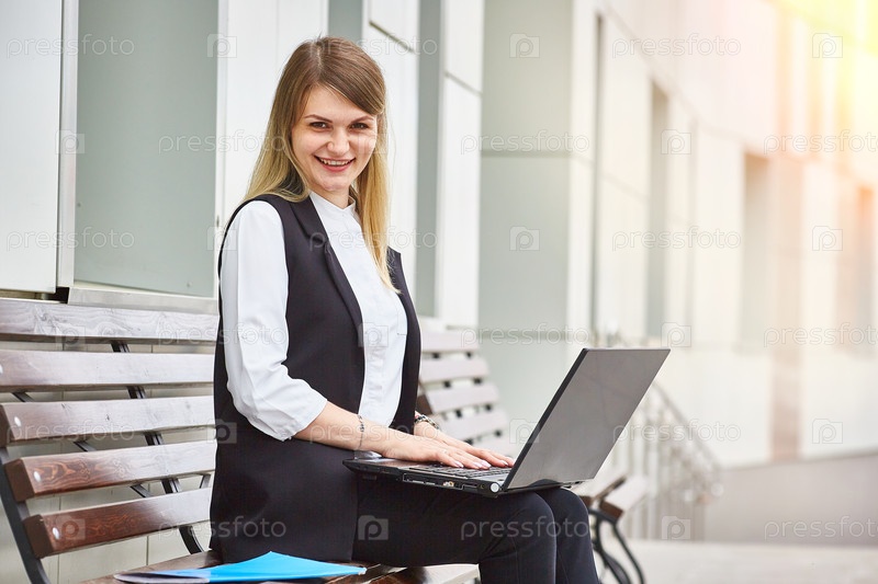 Привлекательная девушка сидит на скамейке возле делового здания с ноутбуком