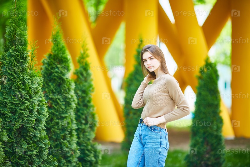 Девочка-подросток на улице в прохладный летний день в свитере и джинсах